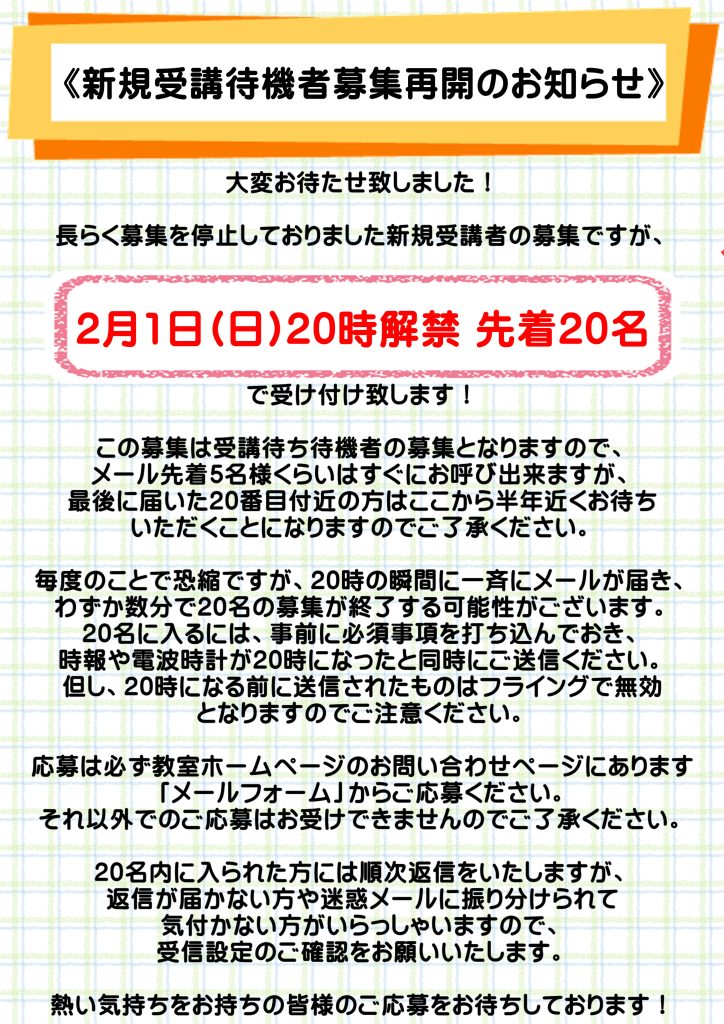2月1日(日)20時に新規受講待機者の募集を解禁いたします。